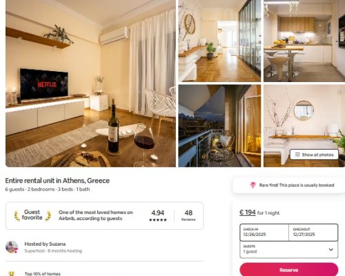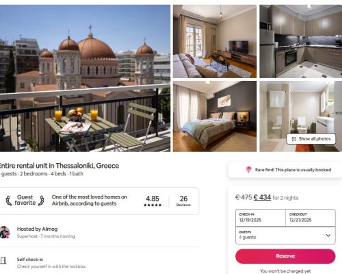 האמת שלא חשבתי שזה יהיה עד כדי כך לפרצוף, פשוט פתחתי חיפוש במרכז סלוניקי (שימו לב שבחרתי 6 אורחים כדי שיפלטר לי רק דירות של לפחות שני חדרי שינה + סלון – באלה מכניסים את התשואה הגבוהה ביותר. תלמדו זאת איתי), וכל 6 הדירות הראשונות הן של לקוחות שלנו: